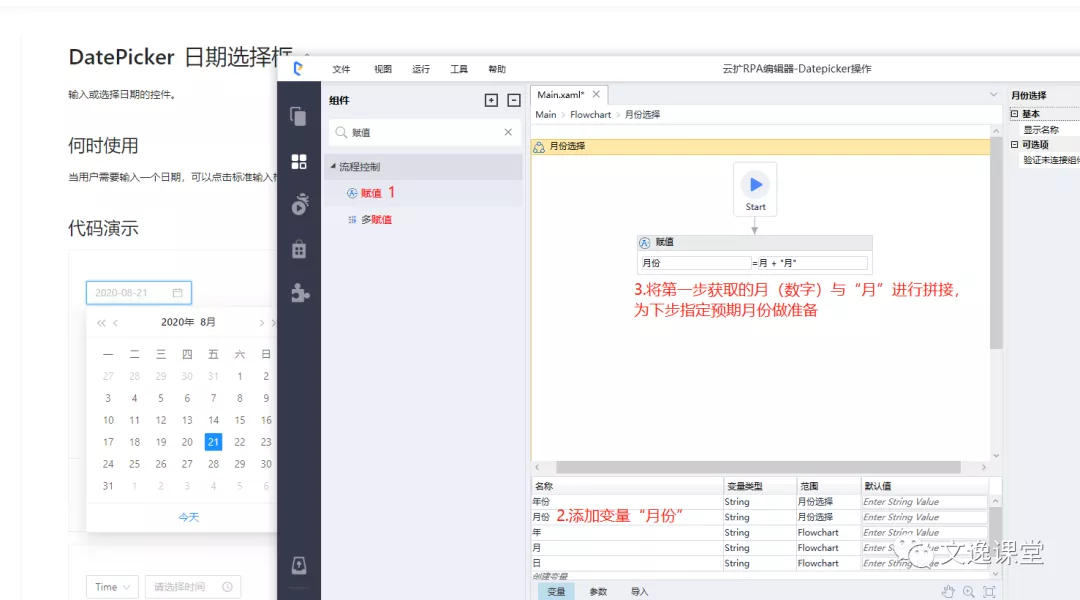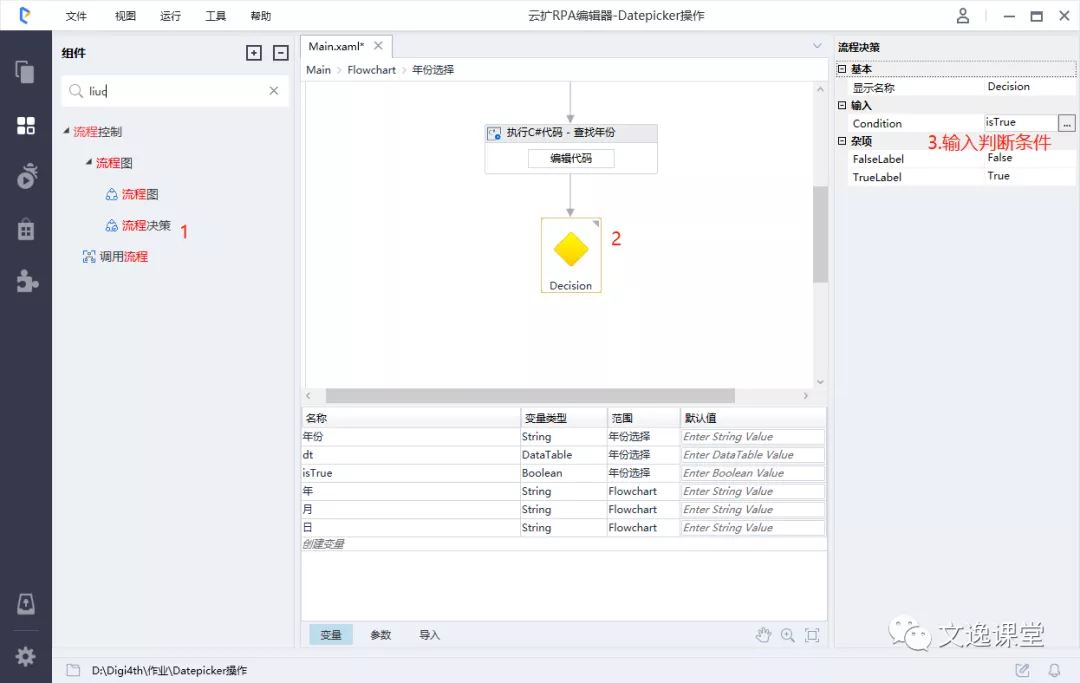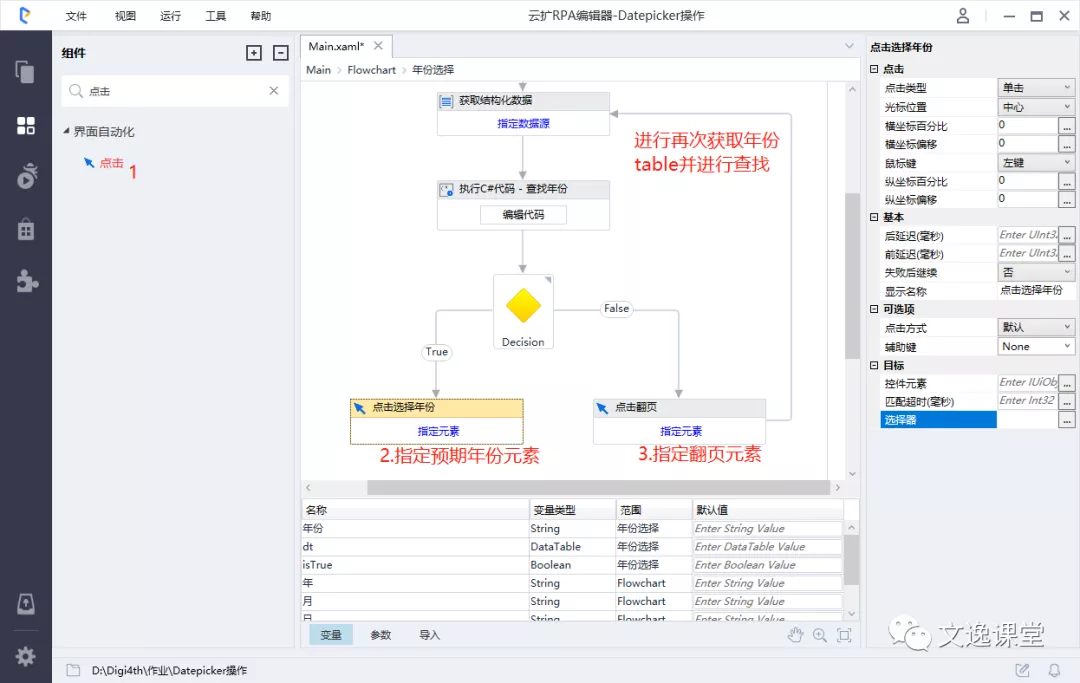 - 在流程图中,设置字符串型变量 年 与参数 年份增量。