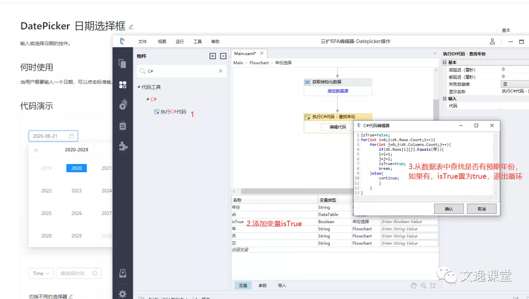 拖入C#组件,从上步获取的数据表中循环查找指定年份。如果包含,则赋值isTrue为true,为下一步做准备: