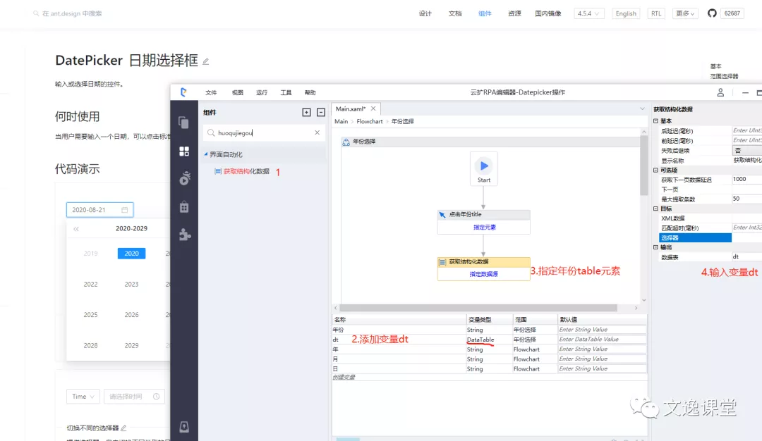 拖入获取结构化数据组件,获取该面板所有年份。查看指定年份是否包含在内。如果不包含,则点击上一页或者下一页按钮翻页):