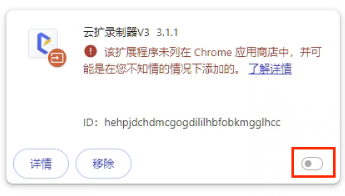 - 安装完扩展后(已安装可跳过),打开浏览器扩展扩展管理,删除扩展“云扩录制器”;